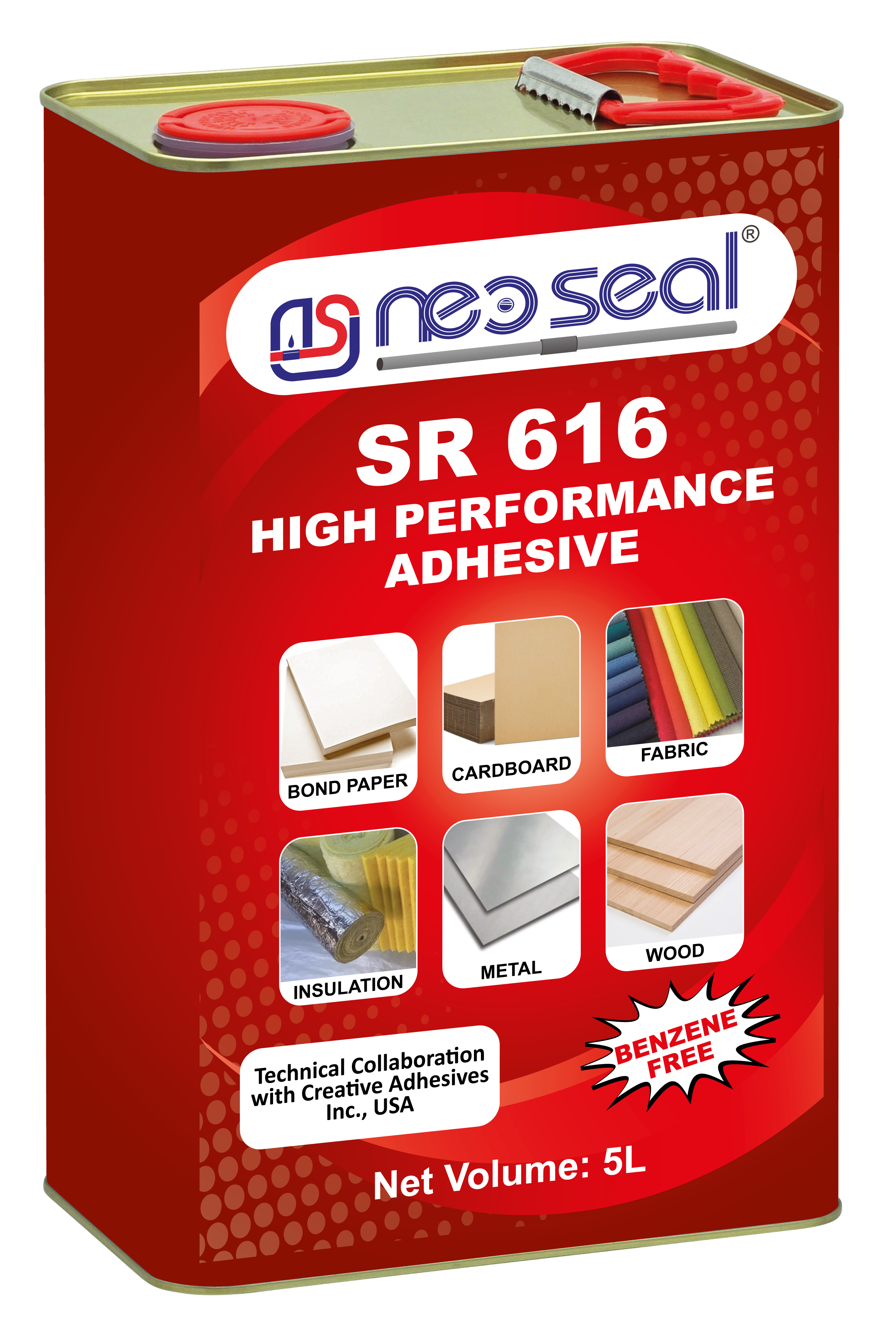 • NeoSeal® SR 616 is a light yellowish-brown colour, multipurpose synthetic rubber-based sprayable adhesive. It has excellent bonding strength and suitable for bonding variety of substrates such as rubber, leather, rexine, wood, plywood, laminate, cardboard, fabric, canvas, metal etc. It has excellent spreadability and fast drying properties. Stored between 2°C and 35°C.