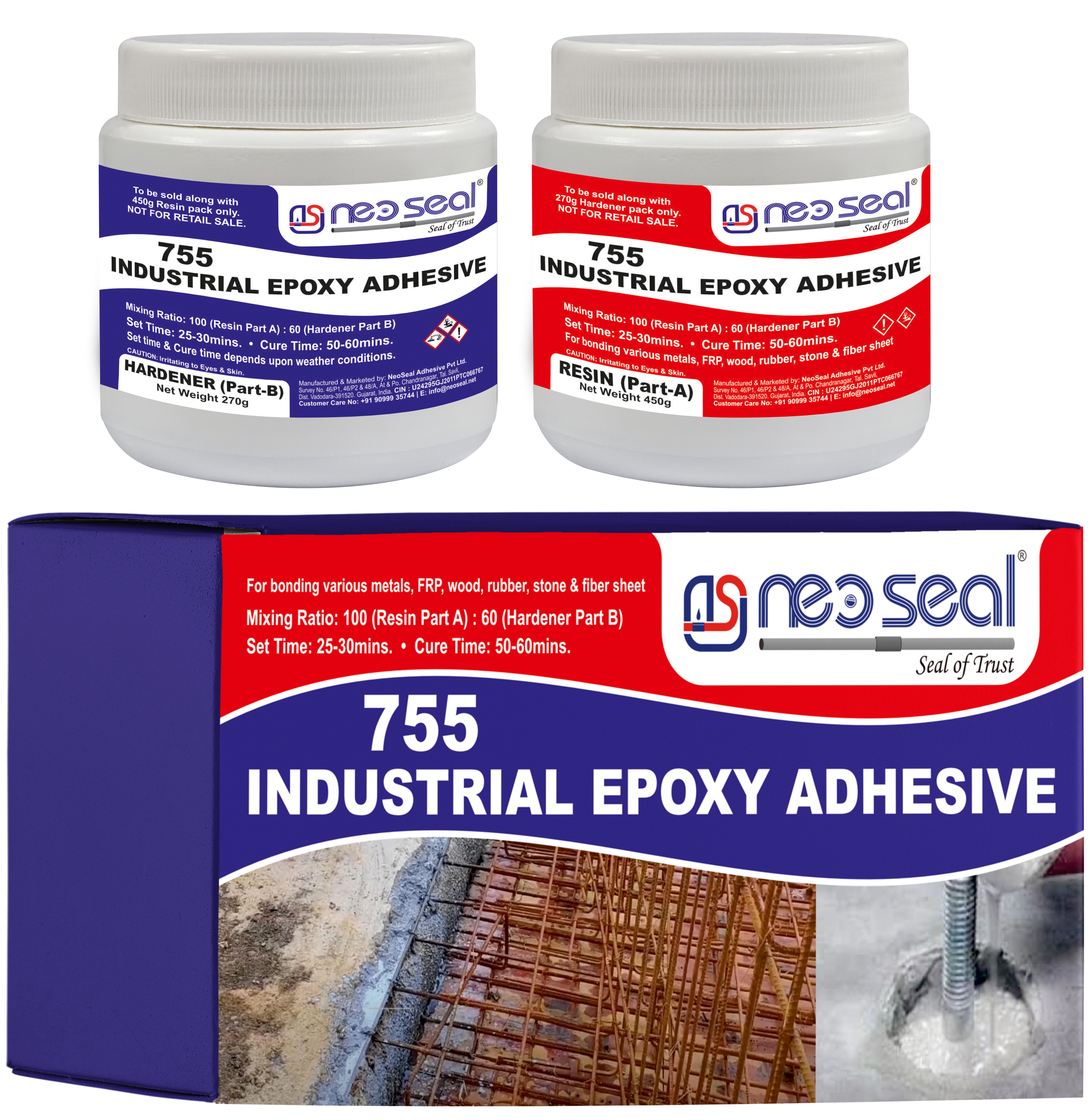 • Neoseal® 755 Epoxy Adhesive is a slight yellowish, two component, high strength adhesive that chemically cures at room temperature in 30-40 minutes for most projects. It has good adhesion to a variety of substrate including fiber sheet, glass, metals, plastic, wood, concrete, stone, etc. It has an excellent chemical resistance to moisture, salt water, detergents, gasoline, hydraulic fluids, antifreeze, automotive fluids, acids, and bases.APPLICATION AREAS: Ideal for industrial, electrical, automotive, steel, glass, metal, stone, vulcanized fiber sheet, ornaments, textile industries, handicrafts, house hold items.
