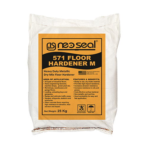 • NeoSeal® 573 Floor Hardener FH is a cement-based formulation prepared with blend of high strength cement, high quality graded quartz aggregates, polymer additives and some chemicals. It provides concrete surface with extremely hard wearing surface recommended for all area of heavy industrial use. It provides a highly abrasion resistance industrial surface which resists corrosion and absorption of grease, oils, alkalis and most chemicals. Used for hardening freshly placed horizontal concrete slabs and toppings.